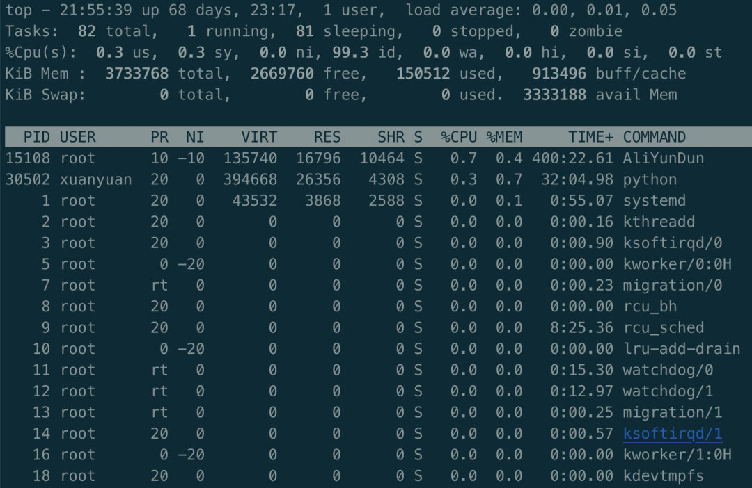 top命令站了起来,面露得意之色,说到:“大家请看好了”,说完,打印出了当前的进程列表: