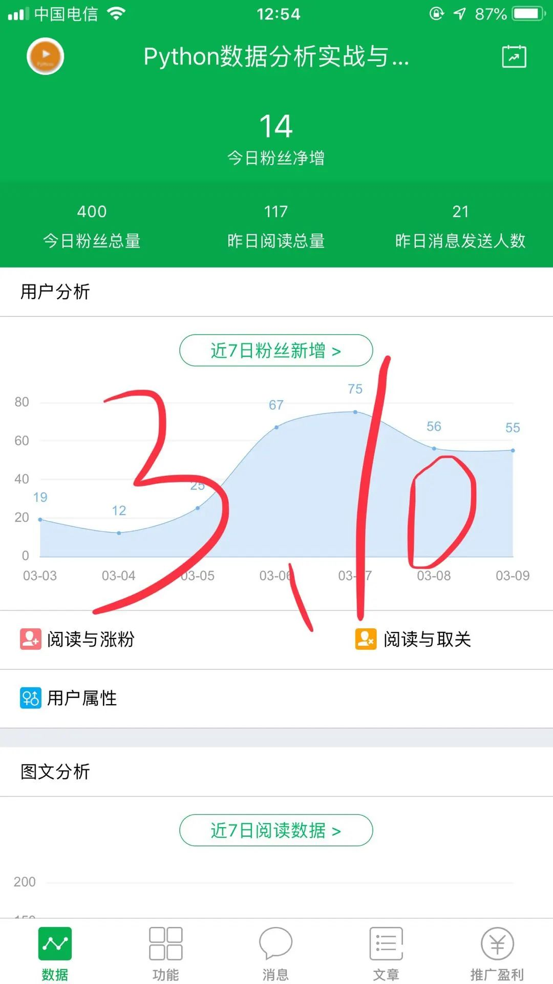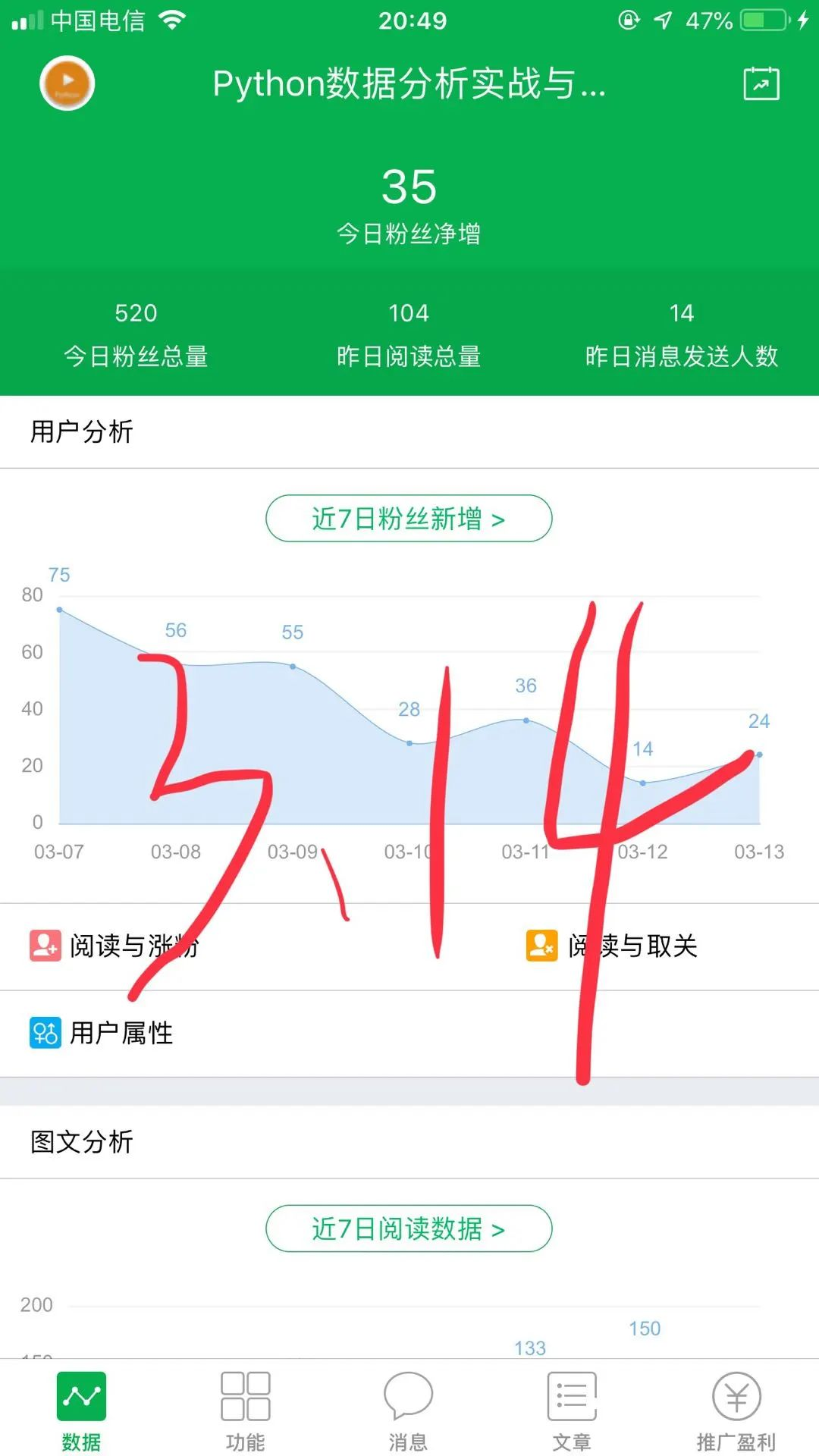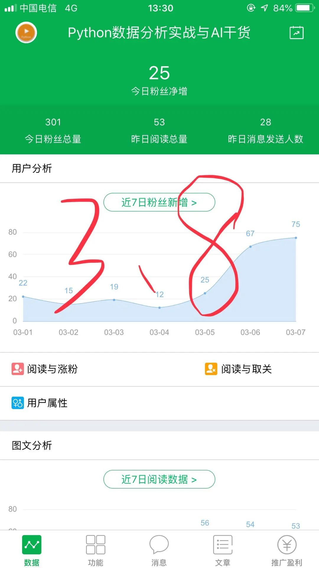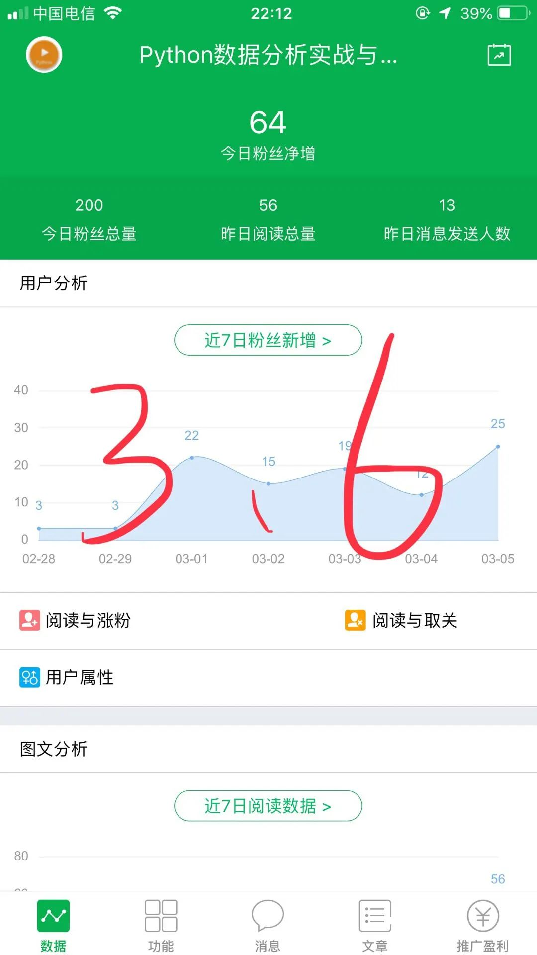 一开始我的粉丝只有10几个,没事的,很正常,我安慰自己,你的文章首先得有内容啊,需要时间的积累,慢慢就会被有眼光的人发现了,我继续写。那一周基本都没什么增长,好多天都是0(习惯就好),这也和微信本身是个闭环有关,就在我快要心灰意冷的时候,感谢那些大佬对我的文章的转发使我渐渐有了人气,那时候的增长是这样的: