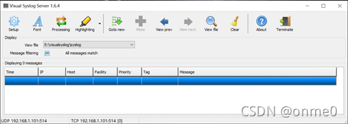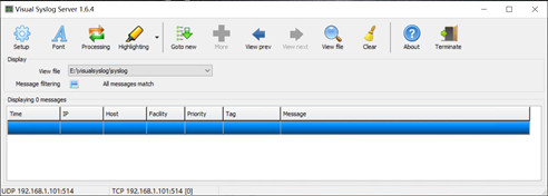 在windows系统上安装Visual Syslog Server,很简单,持续点击“下一步”即可,下图是安装完成打开后的界面。