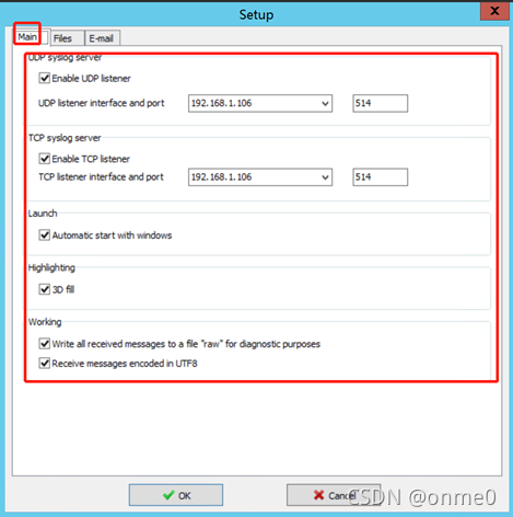 Main配置案例如下图所示。日志服务监听服务协议(UDP和TCP)、IP(192.168.1.106)和端口(514);打开开机自启动和接收采用UTF-8编码的日志信息等功能。