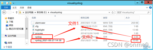 Files配置案例如下图所示。日志信息保存文件(E:\visualsyslog\syslog);生成日志文件转存策略(保存的文件每达到10KB,日志文件将syslog_yyyy-mm-dd-hh-nn命名,文件数量的上限是100个)。