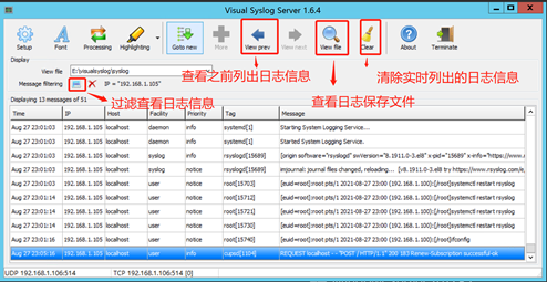 软件主页面,可清除实时列出的日志信息,查看保存的日志信息文件、查看之前列出的日志信息(包括之前转存日志文件中的日志信息)和过滤的方式查看日志信息,如下图所示。