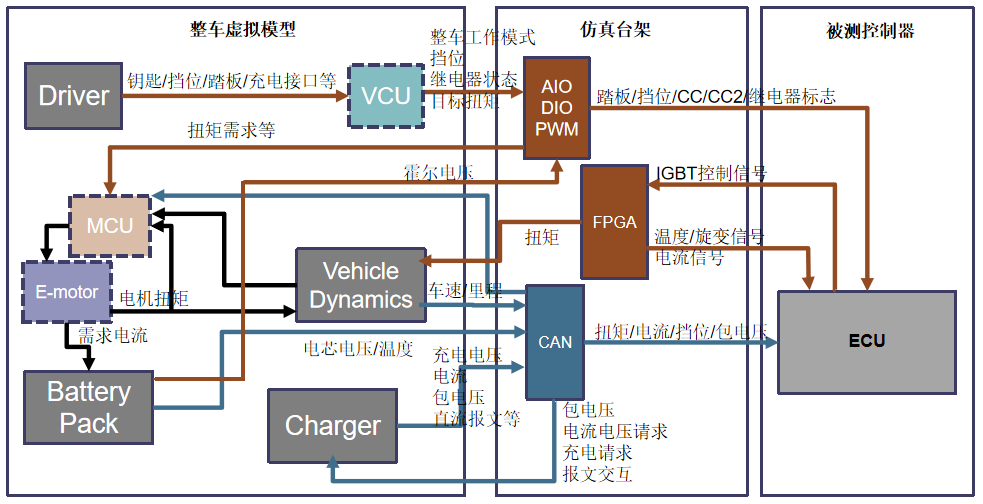 整车模型可模拟汽车整个运行工况。包含有驾驶员模块,充电桩模块,电池包模块,动力传动模块,其他ECU模块。 驾驶员模块:模拟输出钥匙、挡位、油门踏板、刹车踏板、充电插枪等动作信号; 充电桩模块:模拟交直流充电国标; 电池包模块:通过数学模型模拟磷酸铁锂和三元电池状态; 动力传动:模拟电机特性,车轮扭矩、转速,以及汽车运行阻力; 其他ECU模块:根据被测控制器的不同,输出和处理与被测控制器之间的交互信号;