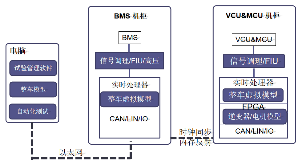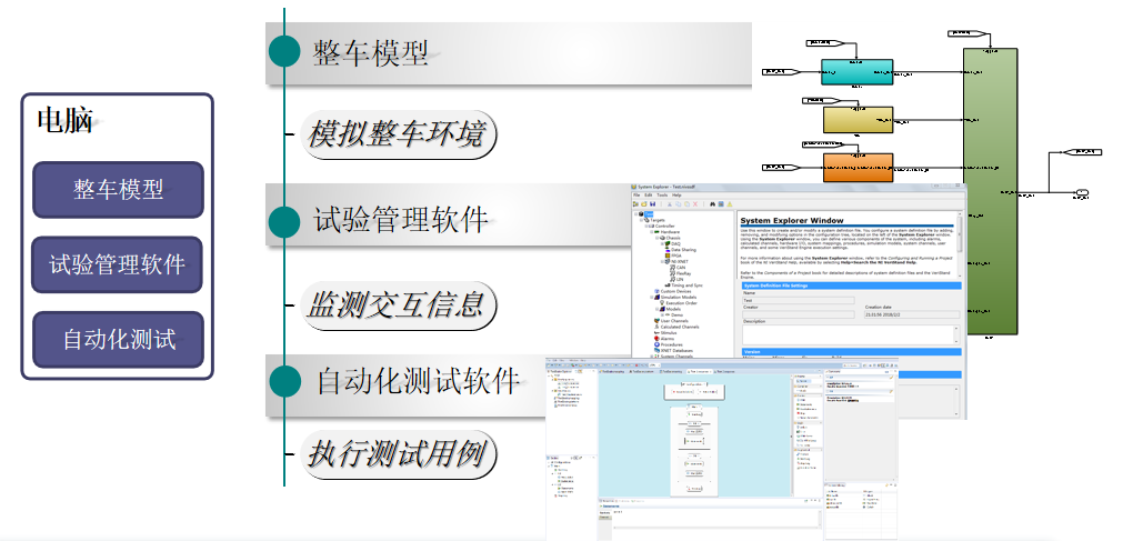 电脑上运行试验管理软件、自动化测试软件,从而向控制器发送硬线和CAN信号等控制命令,并且回读控制器发送的硬线和CAN信号。整车模型模拟整车工况 试验管理软件实现HIL系统和控制器的信号交互 自动化测试软件运行测试用例,测试控制器的应用逻辑