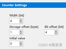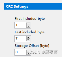 单击后,可进行设置起始位(storage offset),字节宽度(width),计算起始位和停止位(First included byte&last included byte)和高低位(Bit offset)。例如 0CRC Counter0 00 00 00 00 00 00 即代表下图中的设置,crc位在8个字节中的第1个字节,因此crc校验需要从第2位到第8为参与异或运算,counter位在8个字节中的第2个字节,占4个比特,且在8个比特中的后4个(即高位),起始值为0。