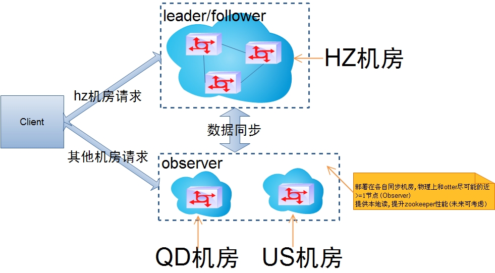 为了提升系统的网络性能,我们在部署zookeeper网络时会在每个机房部署节点,多个机房之间再组成一个大的网络保证数据一致性。(zookeeper千万别再搞多个集群)