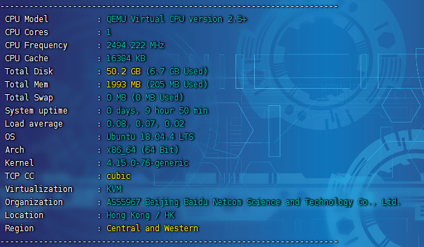 =======================================================================BYTE UNIX Benchmarks (Version 5.1.3)System: ubuntu: GNU/LinuxOS: GNU/Linux -- 4.15.0-76-generic -- #86-Ubuntu SMP Fri Jan 17 17:24:28 UTC 2020Machine: x86_64 (x86_64)Language: en_US.utf8 (charmap="UTF-8", collate="UTF-8")CPU 0: QEMU Virtual CPU version 2.5+ (4988.4 bogomips)x86-64, MMX, Physical Address Ext, SYSENTER/SYSEXIT, SYSCALL/SYSRET18:27:09 up 20:02, 2 users, load average: 0.65, 0.20, 0.06; runlevel 5------------------------------------------------------------------------