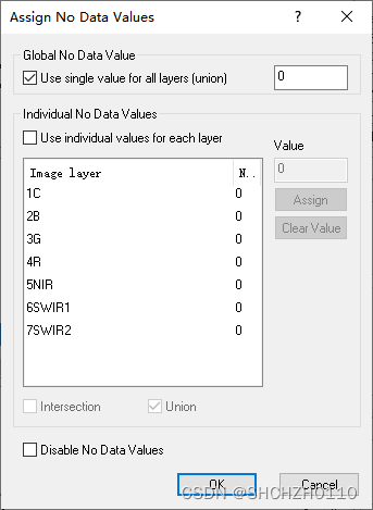 点击界面上的“No Data”按钮,打开对话框后,勾选“Use single value for all layers(union)”去除的值为“0”将遥感影像的黑边去掉,后续分割就不会将黑边分割了。