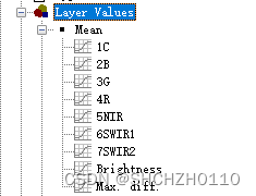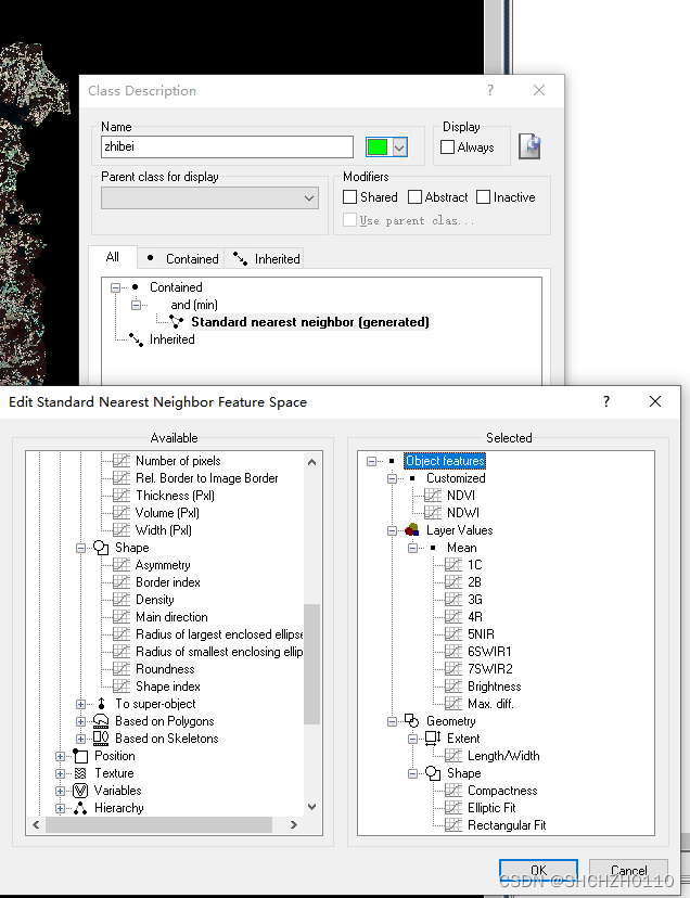 选择分类使用的特征,这里我们选择各波段特征、NDVI、NDWI、长宽比、矩形度、椭圆度、紧致性等特征。