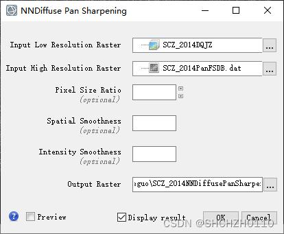 使用工具栏“NNDiffuse图像融合”工具。在对话框中,填入低分辨率的多光谱图像和高分辨全色影像。