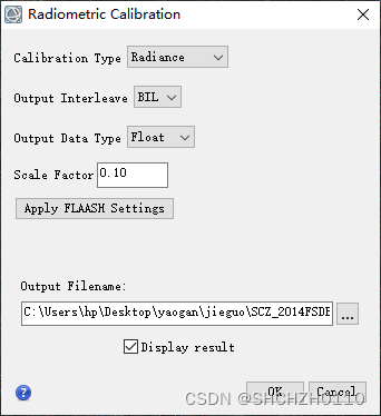 单击确定,进入下一步,在“辐射定标”对话框设置如下参数,因为后续要进行FLASS大气校正,点击面板上的“应用FLASS设置”按钮可以快速自动填充可用于大气校正的参数。设置输出路径,保存定标数据。