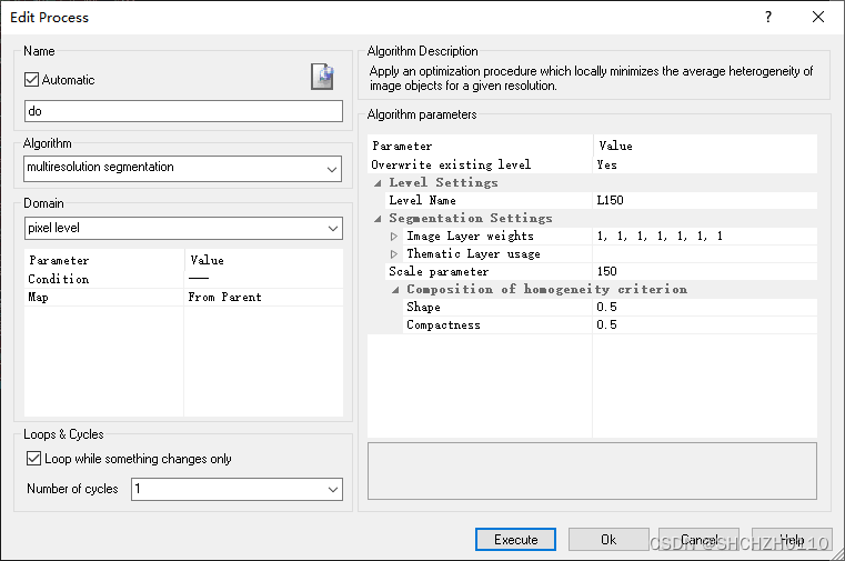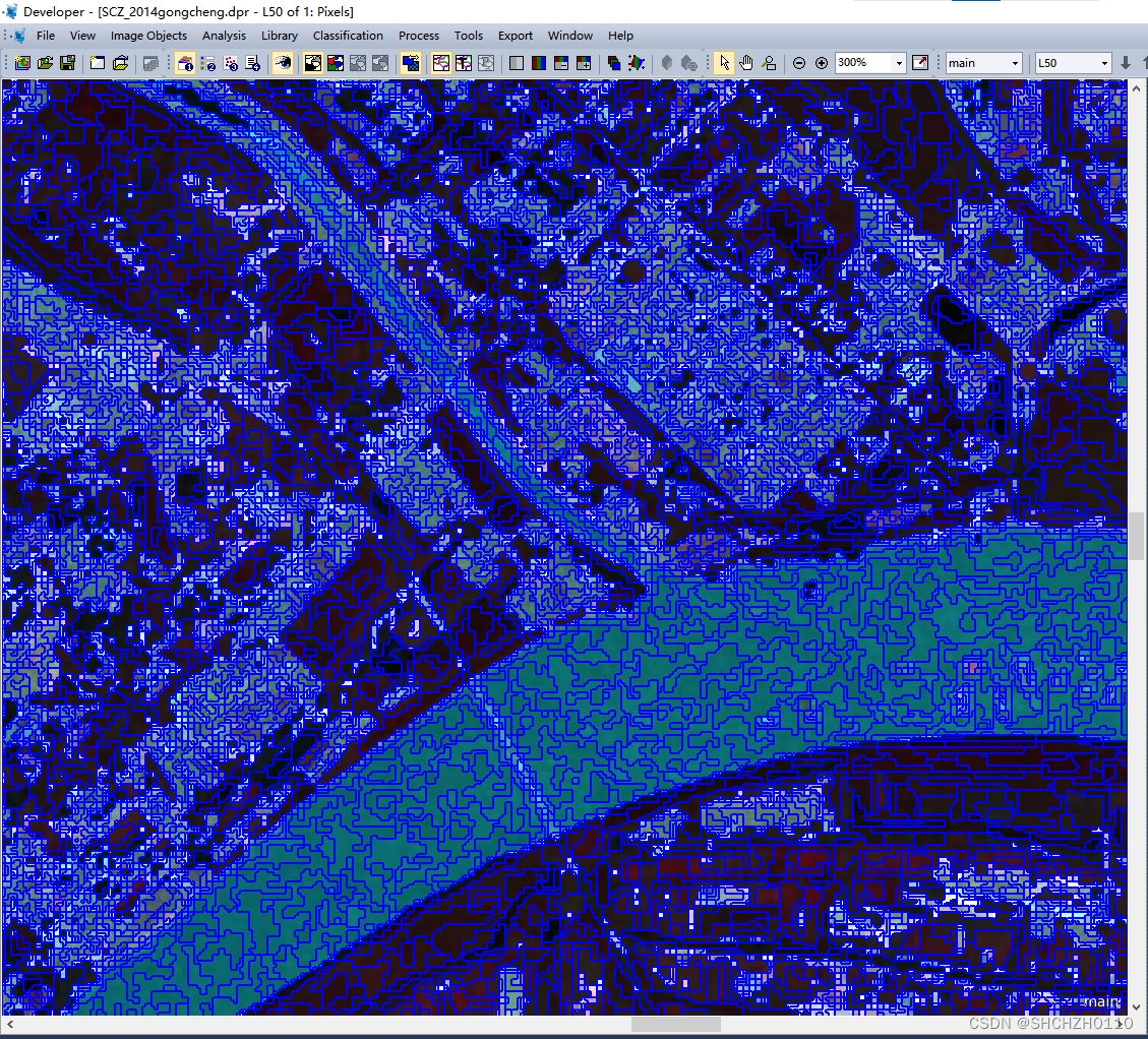 可以看到分割还是比较细碎,进一步区域合并得到更大尺度的分割结果。再添加处理的界面,在L50的基础上继续合并,所以“Domain”这里应该选择对象层,同时这里选择“Create above”尺度设为150,给分割层起名为L150,尺度权值比较大时,形状权值设的大一些,设为0.5 。