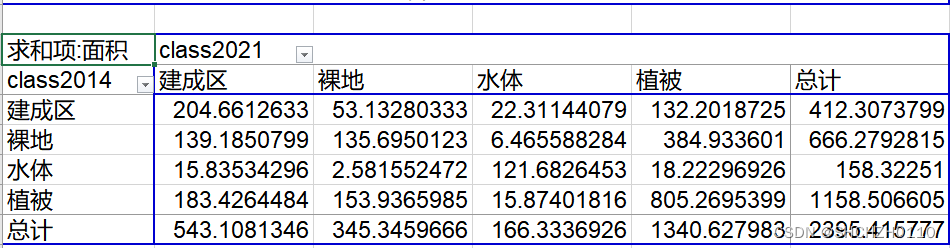 在ARCMAP中对两年矢量数据的融合结果再进行“相交”操作,将相交后的属性表导出为excel表,在excel表中建立数据透视表得到土地利用类型转移矩阵(单位km2)。