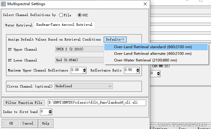点击底部的 Multispectral Setting 按钮,在Multispectral Settings 对话框中,选择 Kaufman-Tanre Aerosol Retrieval→ Defaults→ Over-Land-Retrieval Standard(660:2100nm)