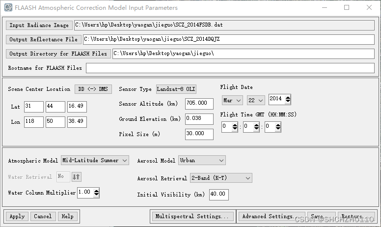 回到 FLAASH Atmospheric Correction Model Input Parameters 对话框,选择传感器类型为Landsat-8 OLI,填写卫星高度705km,平均高程0.038km。成像季节根据ENVI帮助里的介绍选择MLS,气溶胶模型根据影像特点选择Urben。