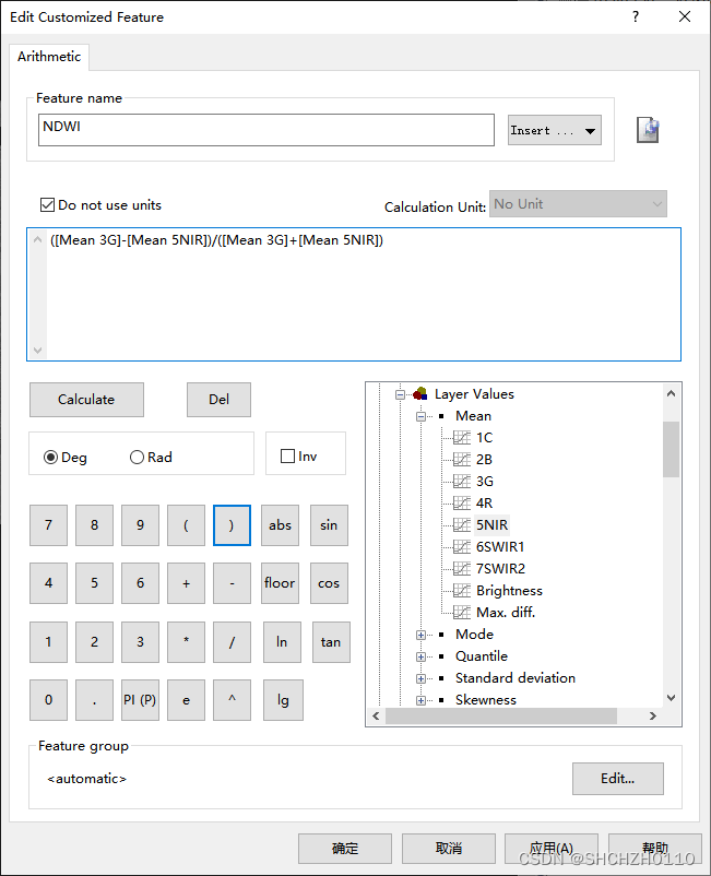 点击用户自定义特征,在出现的界面里输入特征的四则运算,计算 NDVI。
