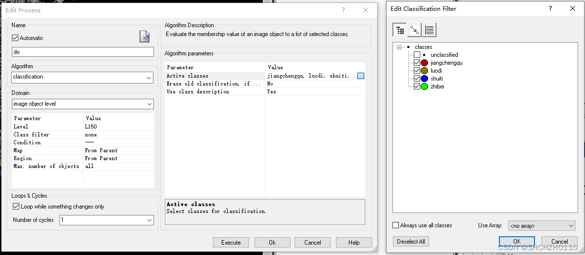 然后进行分类过程,在“process tree”右击添加一个“classification”处理,分类层选择 L150,在 Active Classes 里选择所有类别。