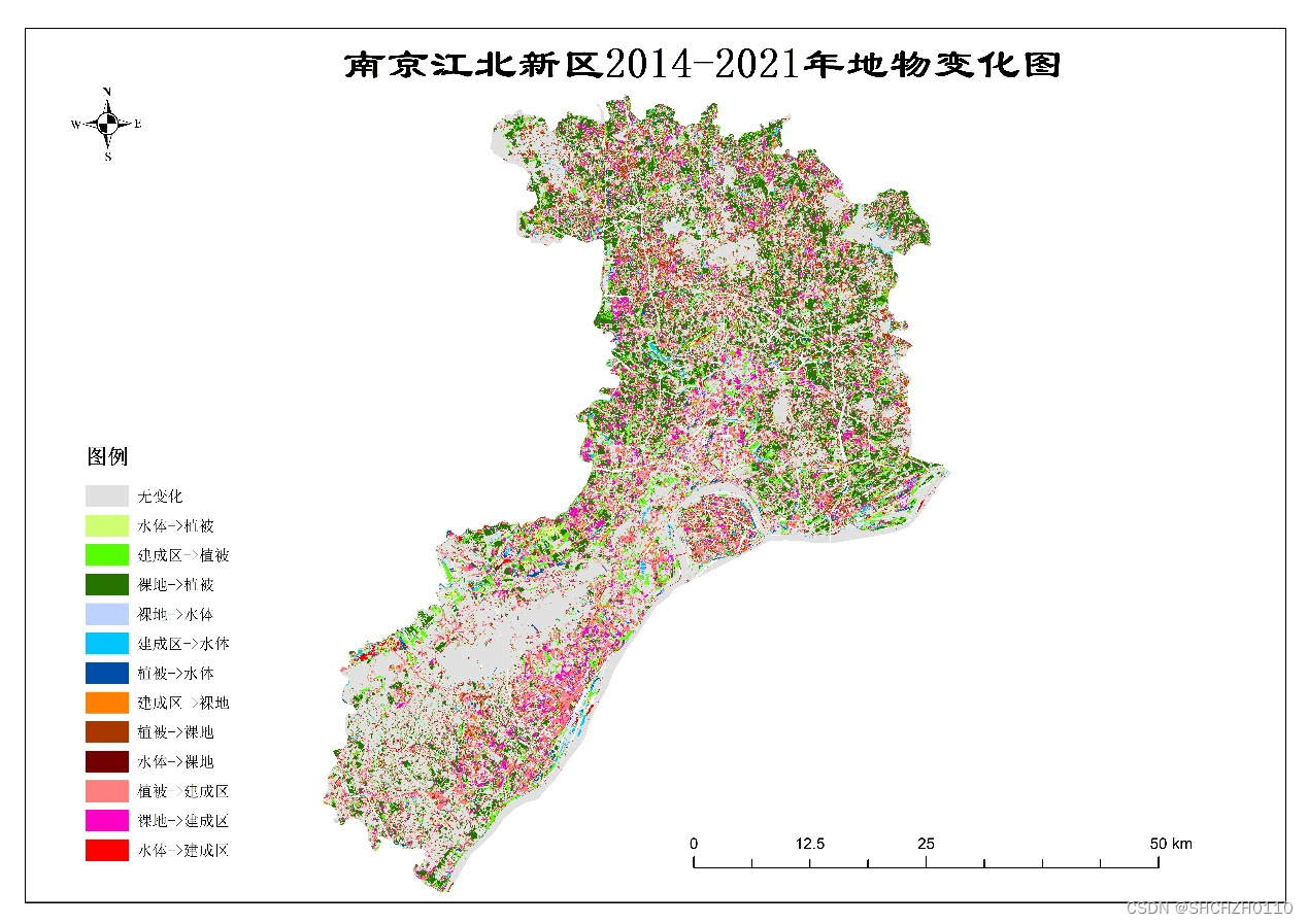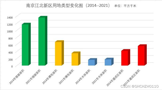 南京的江北新区是2015年提出的在南京长江北设置的新区南京城市扩张的新发展极,经过这些年的发展,土地利用类型变化较大。
