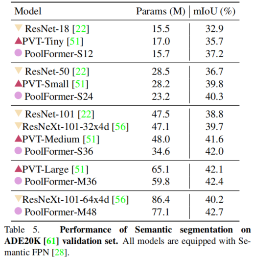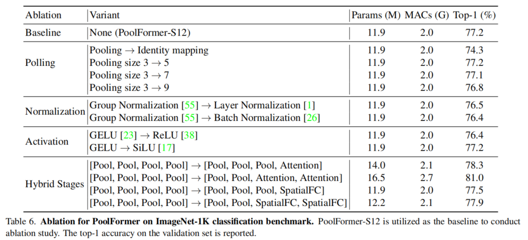 - Pooling: 简单非参数Pooling作为token mixer,得到了可竞争性的效果