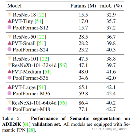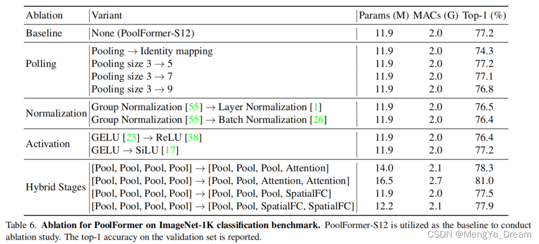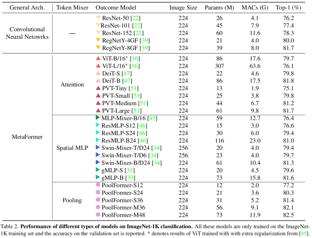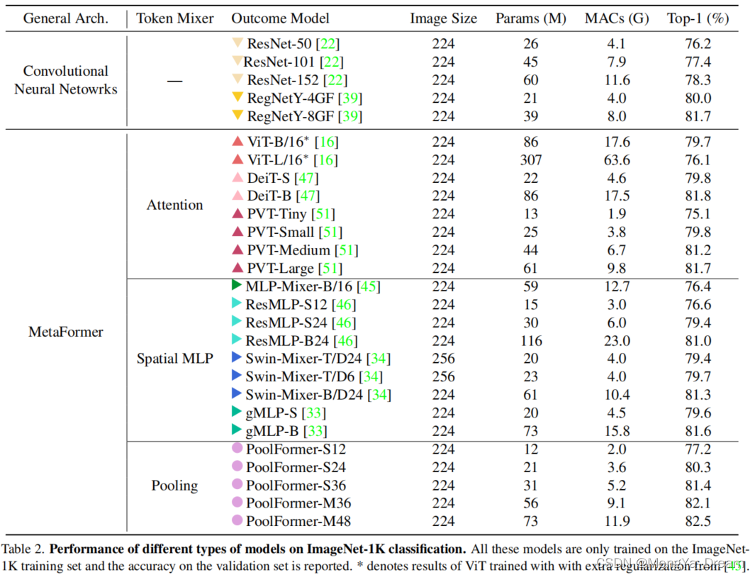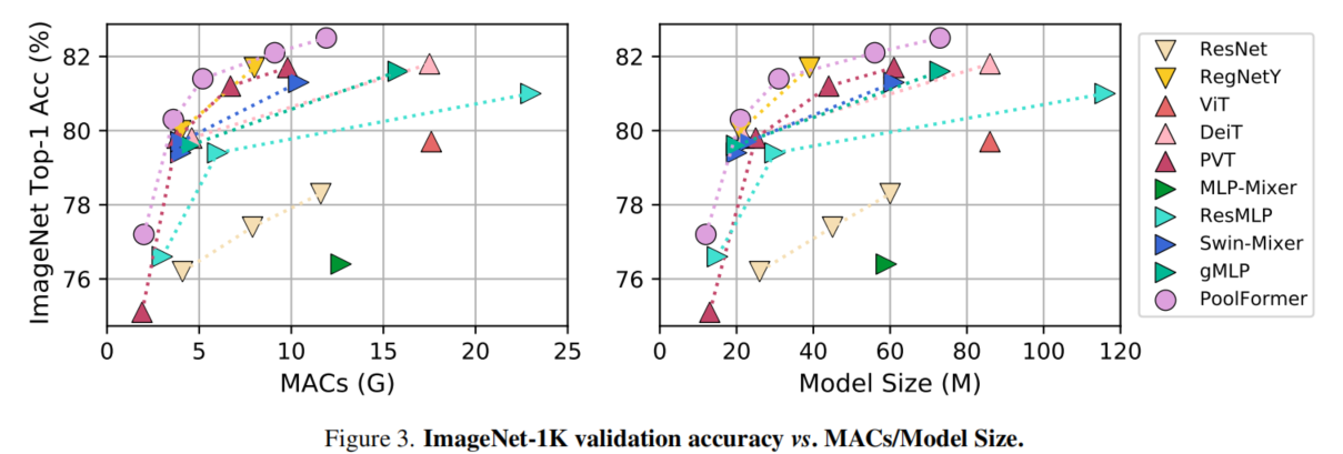 - 该模型被命名为PoolFormer,并在性能、参数数量和 MAC(乘积和累加)方面与经典的 Transformer(例如 DeiT)和 MLP-like(例如 ResMLP)模型进行了比较。