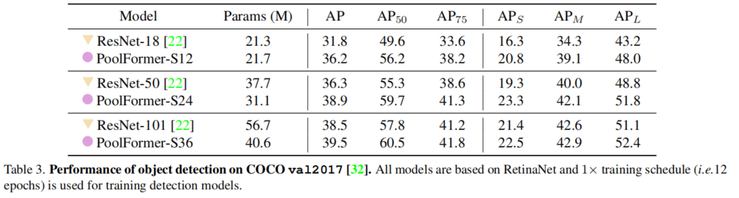 这种非常简单的实现结果令人惊讶。对于图像分类任务,在 ImageNet-1K 数据集上进行测试,PoolFormer 达到了 82.1% 的 top-1 准确率,超过了经典的 Transformer 实现,尤其是 DeiT 0.3%,参数减少了 35%,MAC 减少了 48%,并且类似于 MLP ResMLP 等实现减少了 1.1%,参数减少了 52%,MAC 减少了 60%。在对象检测、实例分割和语义分割任务中表现出类似的性能。