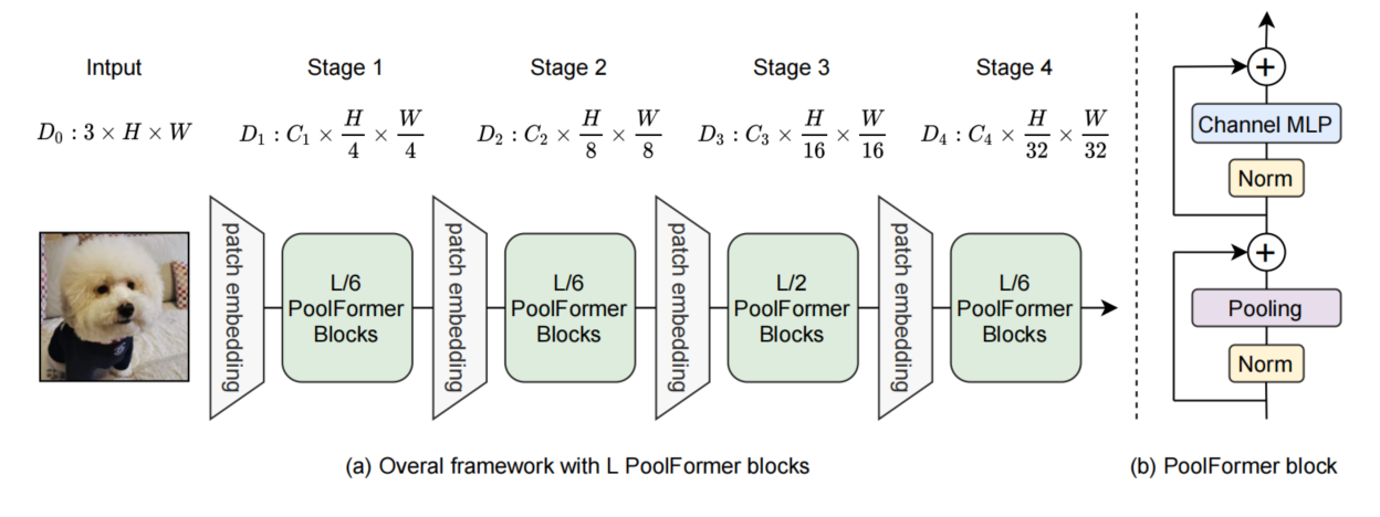 - H和W分别代表输入图片的高度和宽度,Pooling操作代替了Transformer中的self-attention,得到PoolFormer模块,如果总共有L个PoolFormer模块,那么每个阶段的PoolFormer数量分别是L/6,L/6,L/2,L/6个。