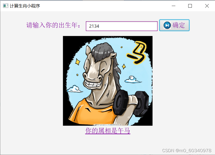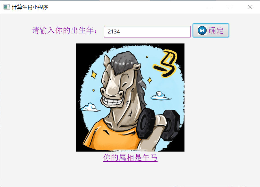 import javafx.stage.Stage;public class Shengxiao extends javafx.application.Application {public static void main(String[] args) {Application.launch(args);}@Overridepublic void start(Stage primaryStage) throws Exception {//图片Image imb = new Image("https://uploadfile.huiyi8.com/2018/af/e7/7c/c0/391613.jpg.270.jpg"); //按钮图Image imb1 = new Image("https://pic57.photophoto.cn/20201206/0017031090838143_b.jpg");Image imb2 = new Image("https://pic57.photophoto.cn/20201206/0017031028186812_b.jpg");Image imb3 = new Image("https://picb5.photophoto.cn/40/016/40016495_1.jpg");Image imb4 = new Image("https://picb5.photophoto.cn/40/016/40016485_1.jpg");Image imb5 = new Image("https://pic57.photophoto.cn/20201206/0017031092262637_b.jpg");Image imb6 = new Image("https://pic57.photophoto.cn/20201207/0017031006359525_b.jpg");Image imb7 = new Image("https://pic57.photophoto.cn/20201206/0017031083851180_b.jpg");Image imb8 = new Image("https://pic57.photophoto.cn/20201206/0017031061861252_b.jpg");Image imb9 = new Image("https://pic57.photophoto.cn/20201207/0005018643161796_b.jpg");Image imb10 = new Image("https://pic57.photophoto.cn/20201206/0017031081040046_b.jpg");Image imb11 = new Image("https://pic57.photophoto.cn/20201206/0017031036363850_b.jpg");Image imb12 = new Image("https://pic57.photophoto.cn/20201207/0017031006303595_b.jpg");ImageView iv = new ImageView(imb);ImageView iv1 = new ImageView();iv.setFitHeight(20);iv.setFitWidth(20);iv1.setFitHeight(250);iv1.setFitWidth(250);//控件Label lb1 = new Label("请输入你的出生年:");TextField tf1 = new TextField();Button btn1 = new Button("确定",iv);Label lb2 = new Label("");//要展示的结果Color color1 = new Color(0.5,0,0.6,1); Font fon = Font.font("Times New Roman",FontWeight.BOLD,FontPosture.REGULAR,18);//样式lb1.setFont(fon);lb1.setTextFill(color1);tf1.setPrefSize(200, 40);tf1.setStyle("-fx-border-color:purple");btn1.setFont(fon);btn1.setTextFill(new Color(0.5,0,0.6,1));//容器VBox vbox = new VBox(20);HBox hbox = new HBox(5);hbox.getChildren().addAll(lb1, tf1, btn1);vbox.getChildren().addAll(hbox,lb2);hbox.setAlignment(Pos.BASELINE_CENTER);vbox.setAlignment(Pos.BASELINE_CENTER);//窗口Scene scene = new Scene(vbox, 600, 400);scene.setFill(color1);primaryStage.setScene(scene);primaryStage.setTitle("计算生肖小程序");primaryStage.show();class Calc implements EventHandler{@Overridepublic void handle(ActionEvent event) {int year = Integer.valueOf(tf1.getText());int x = (year + 9) % 12;String name = "";switch(x) {case 1: name = "子鼠";iv1.setImage(imb1);break;case 2: name = "丑牛";iv1.setImage(imb2);;break;case 3: name = "寅虎";iv1.setImage(imb3);break;case 4: name = "卯兔";iv1.setImage(imb4);break;case 5: name = "辰龙";iv1.setImage(imb5);break;case 6: name = "巳蛇";iv1.setImage(imb6);break;case 7: name = "午马";iv1.setImage(imb7);break;case 8: name = "未羊";iv1.setImage(imb8);break;case 9: name = "申猴";iv1.setImage(imb9);break;case 10: name = "酉鸡";iv1.setImage(imb10);break;case 11: name = "戌狗";iv1.setImage(imb11);break;case 0: name = "亥猪";iv1.setImage(imb12);break;}iv1.setSmooth(true);iv1.setCache(true);lb2.setText("你的属相是" + name);lb2.setGraphic(iv1);lb2.setFont(fon);lb2.setContentDisplay(ContentDisplay.TOP);lb2.setUnderline(true);lb2.setTextFill(color1);}}btn1.setOnAction(new Calc());}