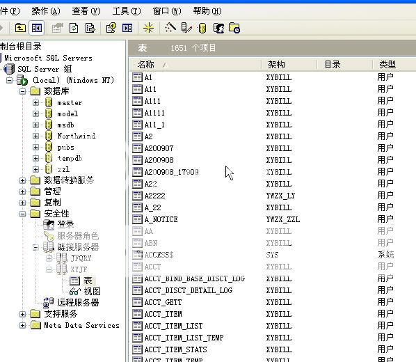 6.回到企业管理器的链接服务器这里,把他点开来,点"表",或在右边列表中刷新。