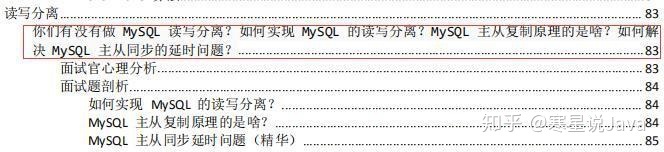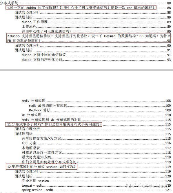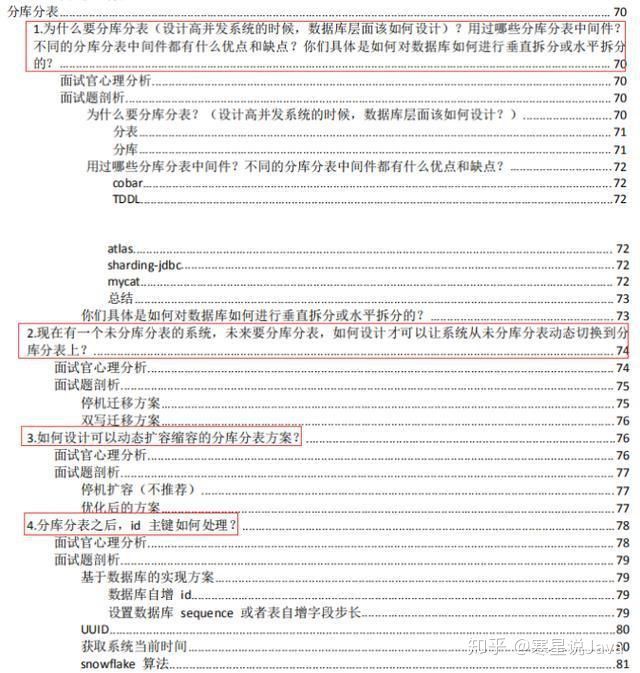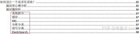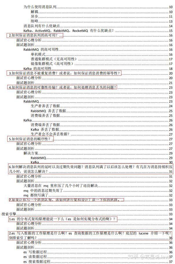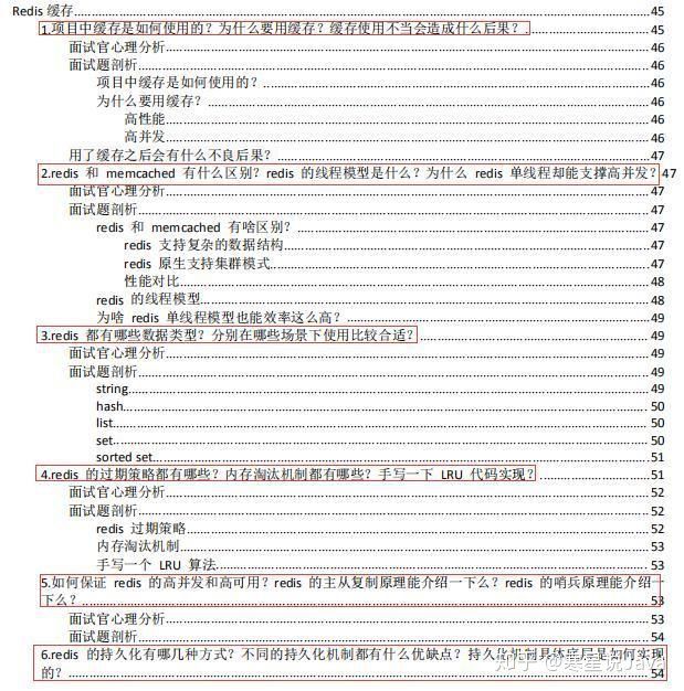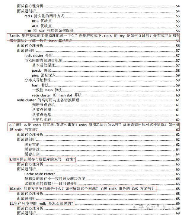 Java高级“程序猿”面试部分(题目已经用红框标出来),我总共分8个部分,有高并发、Redis缓存、分布式、消息队列、高可用、微服务、分库分表、读写分离等,而且每部分的每个题目都有做相应的面试官心理分析以及面试题目剖析,能让我们在面试的时候清楚的了解到此时题目的重点是在哪里,从何下手攻克!