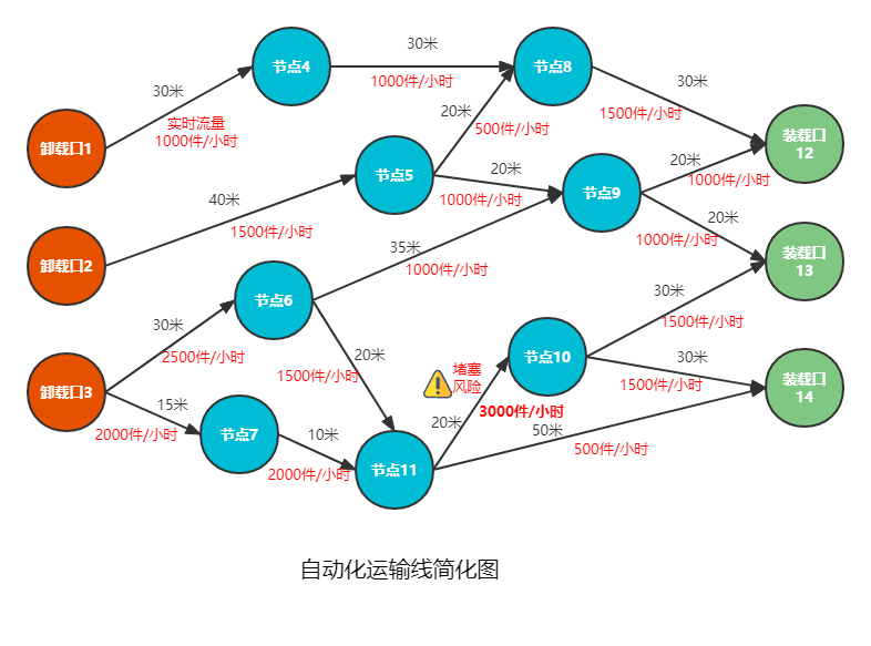 转运中心内自动化设备通过运输线连接,构成一张立体的连通网络,快件达到分流路口需要决策行走支路,确保全程线路最优前提下,同时要避免大量快件涌向最短线路造成拥堵,还需要及时避开故障线路上的故障设备,直到故障得到修复。
