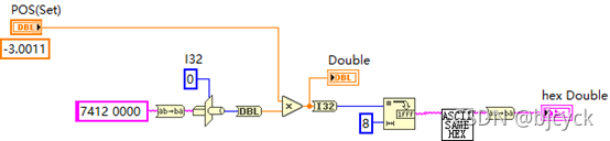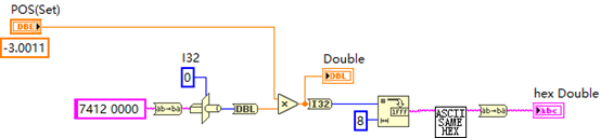 四个字节,用i32 Type Cast进行转换,因为输入有小数点,所以这里用dbl作为输入,乘以脉冲当量后,在转换为I32,之后转换为8个字符长度的十六进制。这里用8而不是4,是因为这里的字符是以ASCII码显示的,经过Convert ASCII String To The Same Hex String (SubVI).vi转换后,就会得到16进制显示的字符串,长度就是4个了。