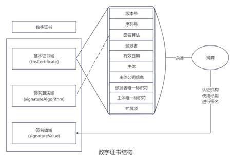 数字证书结构由基本证书域、签名算法域、签名值域三个区域构成:
