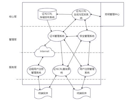数字证书认证系统(也称证书认证系统)是对生命周期内的数字证书进行全过程管理的安全系统,必须采用“双证书”机制,并按照要求建设双中心。证书认证系统在逻辑上分为核心层、管理层和服务层。数字证书认证系统逻辑结构如图: