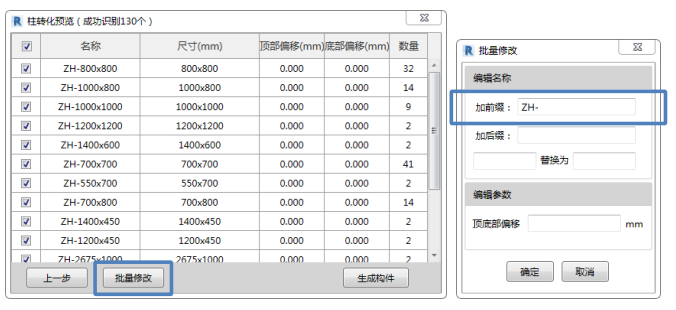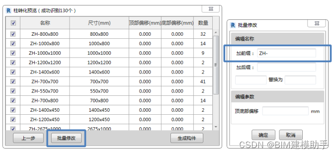 3.识别CAD成功后,可以点击【批量修改】按钮,预设柱实例的部分参数。