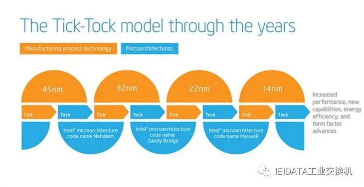 第一,就是转化效率、性能和可靠性的提升。从100G、200G到400G甚至800G。交换机的单板能力不断提升,与 英特尔的TICK-TOCK策略近似(如图9)