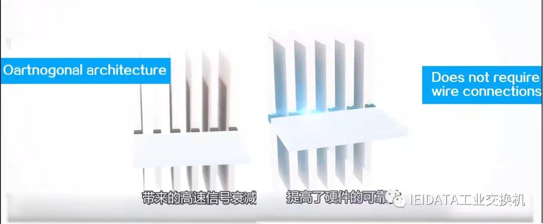 同时,正交设计减少了背板走线,带来的高速信号衰减,提高了硬件的可靠性。(如图12)无背板设计能够解除背板对容量提升的限制,当需要更大带宽的时候,只需要更换相应的板卡就可以实现。目前,大多数园区网以及数据中心级交换机,都采用了这样的设计。