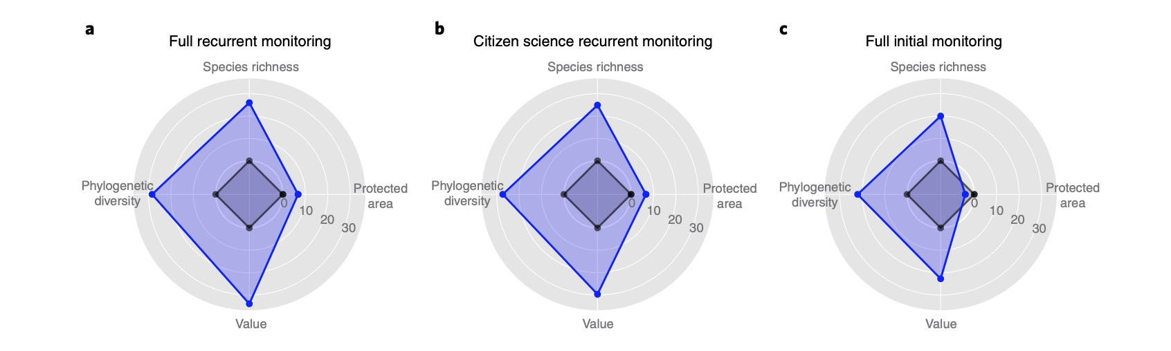 全面的定期监测(系统在每个时间步进行监测,包括物种存在和丰度)导致物种损失最小:它成功保护的物种平均比随机保护策略多 26%