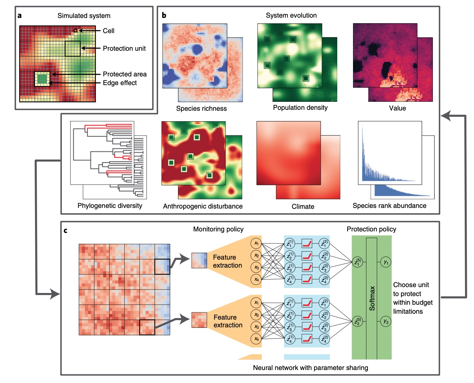 - 定期从系统中提取生物多样性特征,然后输入神经网络,它从系统的进化中学习,以确定最大化奖励的保护政策Reward,例如在固定预算内保护最大的物种多样性。参数x、z和y的向量分别代表神经网络的输入、隐藏层和输出的节点