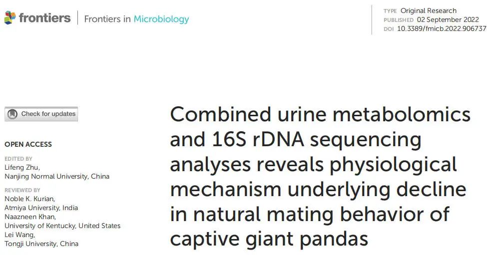 文章题目:尿液代谢组学和微生物多样性联合分析揭示了圈养大熊猫自然交配行为下降的生理机制