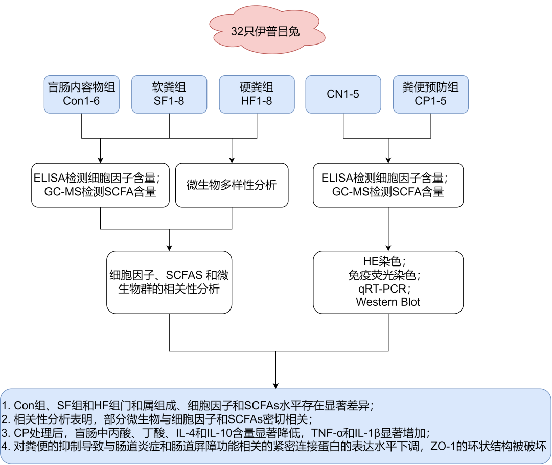 本研究采用高通量测序技术和气相色谱-质谱仪(GC-MS)对伊普吕兔软硬粪便的盲肠内容物、微生物多样性、SCFAs和细胞因子进行分析。随后,通过对家兔的共粪性预防治疗,验证了软性粪便对盲肠免疫微环境的影响,筛选出在调节家兔生长发育和免疫功能中发挥重要作用的关键微生物群及其代谢物,证实了食粪行为不仅可以帮助家兔获得更多的益生菌和SCFAs,而且对改善盲肠免疫微环境具有重要作用。