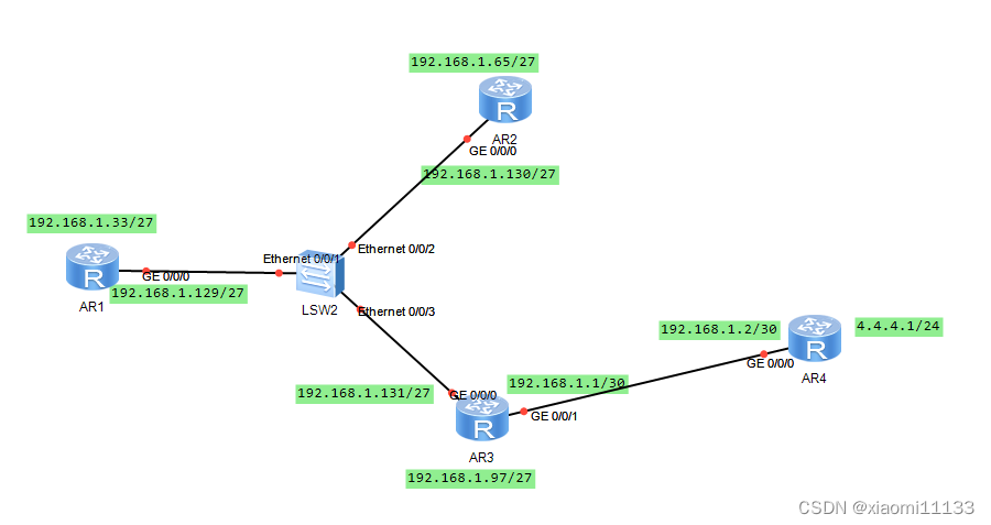 配置如下IP地址,r1-r4环回IP地址以及接口IP地址。