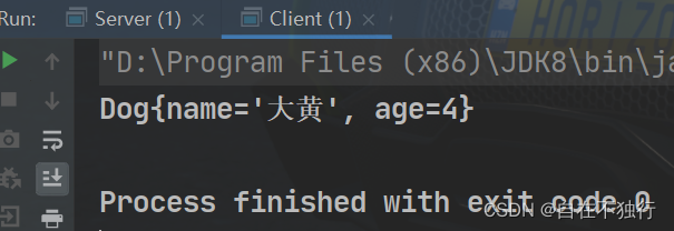 public class Client {public static void main(String[] args) throws IOException, ClassNotFoundException {Socket socket = new Socket(InetAddress.getLocalHost(), 8008);//发送消息OutputStream os = socket.getOutputStream();BufferedWriter bw = new BufferedWriter(new OutputStreamWriter(os));bw.write("hello服务器@");//bw.newLine();bw.flush();socket.shutdownOutput();//接收dogInputStream is = socket.getInputStream();ObjectInputStream ois = new ObjectInputStream(is);Dog dog = (Dog) ois.readObject();System.out.println(dog.toString());//关闭资源socket.close();bw.close();ois.close();}
