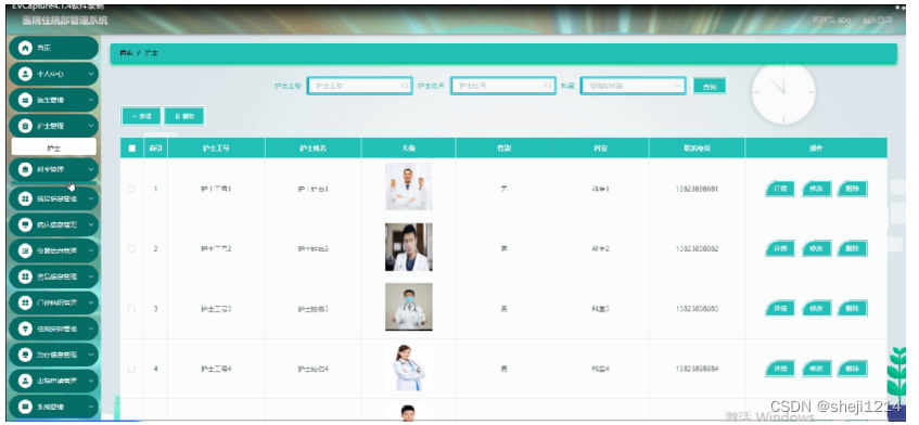 护士管理,在护士管理页面可以对索引,护士工号,护士姓名,头像,性别,科室,联系电话等内容进行详情,修改和删除等操作,如图5-4所示。