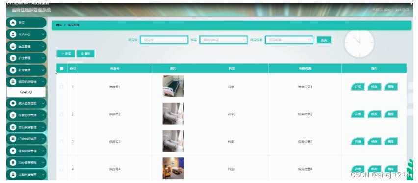 病房信息管理,在病房信息管理页面可以对索引,病房号,图片,科室,病房位置等内容进行详情,修改和删除等操作,如图5-5所示。