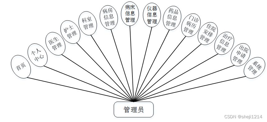 管理员登陆后,主要模块包括首页,个人中心,医生管理,护士管理,科室管理,病房信息管理,病床信息管理,仪器信息管理,药品信息管理,门诊病历管理,住院安排管理,治疗信息管理,出院申请管理,系统管理等功能。管理员用例图如图3-1所示。