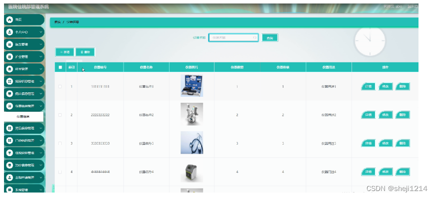 仪器信息管理,在仪器信息管理页面可以对索引,仪器编号,仪器名称,仪器图片,仪器数量,仪器价格,仪器用途等内容进行详情,修改和删除等操作,如图5-7所示。