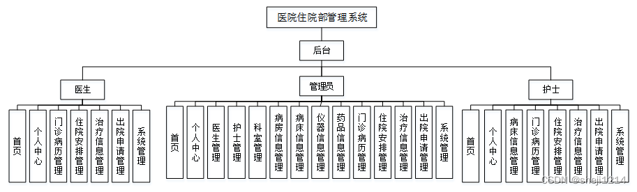 为了更好的去理清本系统整体思路,对该系统以结构图的形式表达出来,设计实现该医院住院部管理系统的功能结构图如下所示: