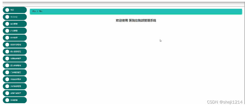 护士登陆系统,可以对首页,个人中心,病床信息管理,门诊病历管理,住院安排管理,治疗信息管理,出院申请管理,系统管理等功能进行详细操作,如图5-12所示。