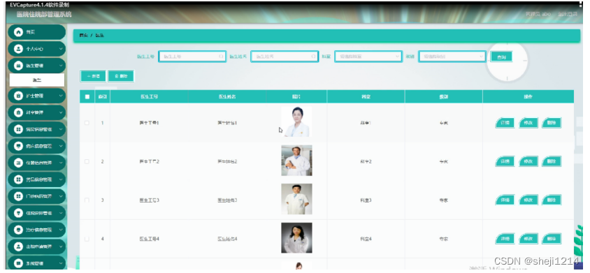 医生管理,在医生管理页面可以对索引,医生工号,医生姓名,照片,科室,级别等内容进行详情,修改和删除操作,如图5-3所示。