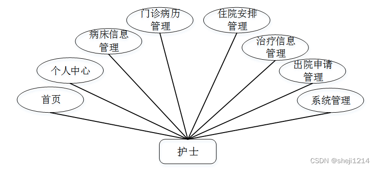 护士登陆后,主要模块包括首页,个人中心,病床信息管理,门诊病历管理,住院安排管理,治疗信息管理,出院申请管理,系统管理等功能。护士用例图如图3-2所示。